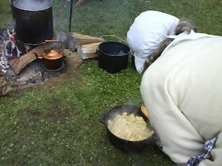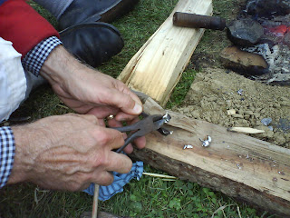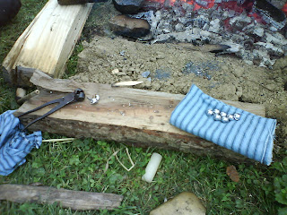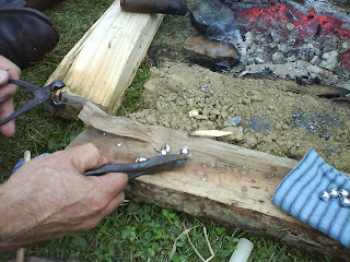 The man sitting on the log had a ladle of molten lead cooking on the fire, which he poured into the mold…