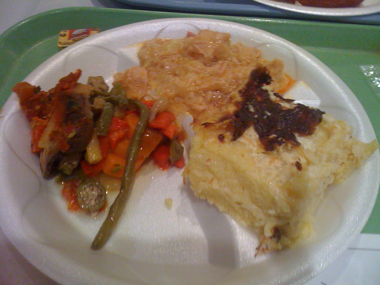 Julia got vegetables, the chicken and dumplings, and a polenta dish with cheese melted in the middle.