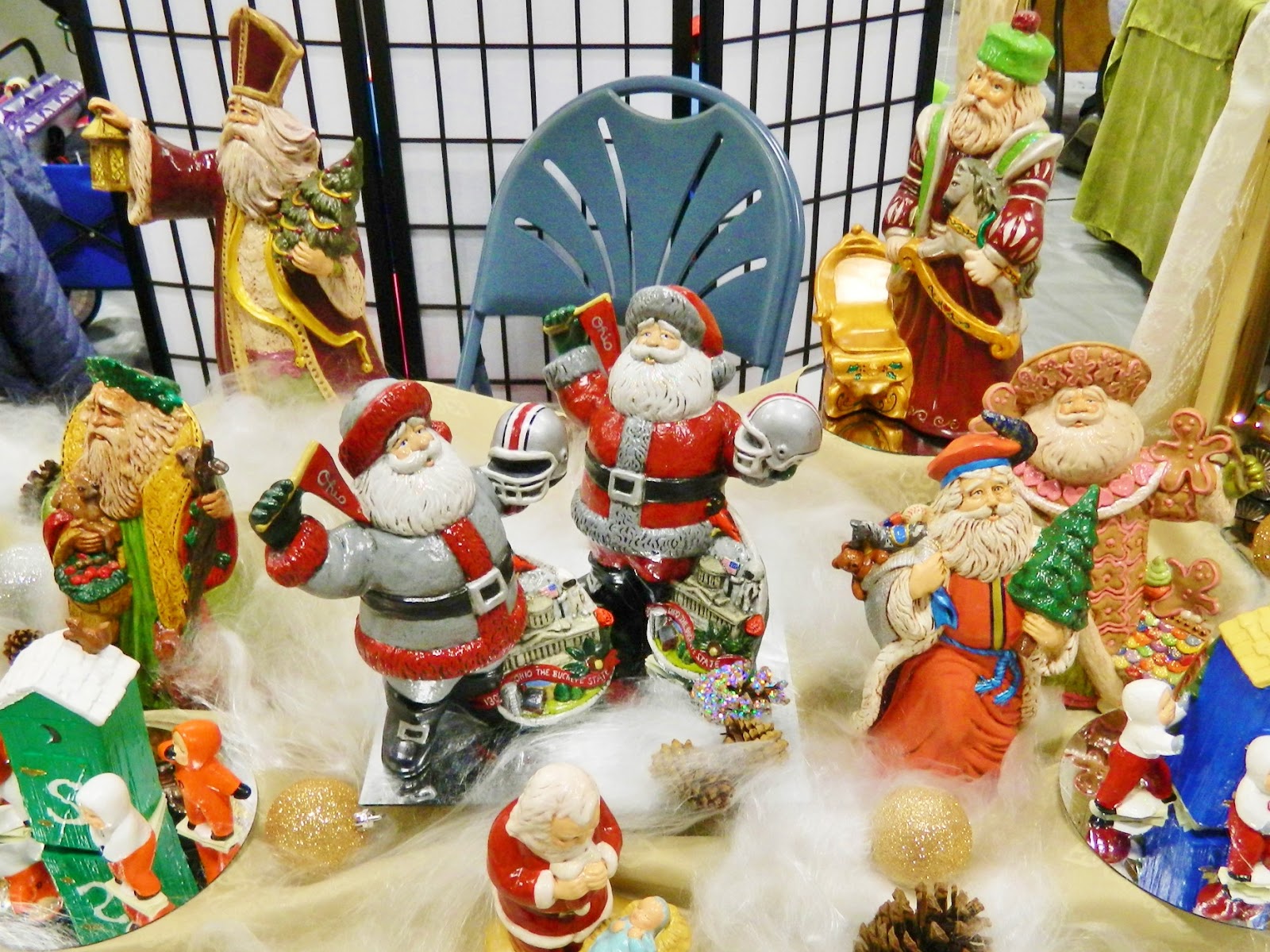 …hand-painted Santas galore (Festive Treasures)…
