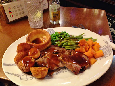 …with a Sunday Roast lamb dinner served with Yorkshire Pudding, potatoes, peas, beans, carrots and gravy.