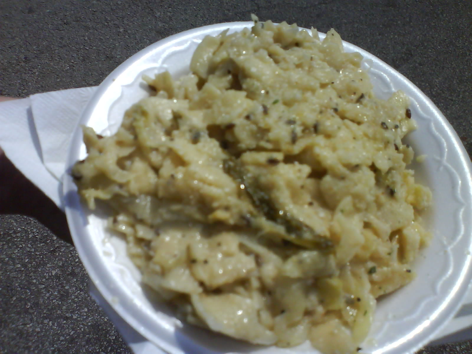 The cabbage and noodles were seasoned with plenty of salt, pepper and celery seed. They were good but hard to eat on such a hot day.