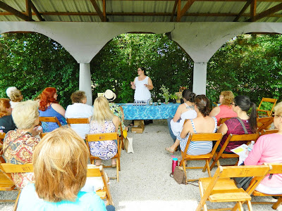 Mary Colvin was explaining Medieval medicinal herbs in a covered garden area (Ancestral Herbology)…