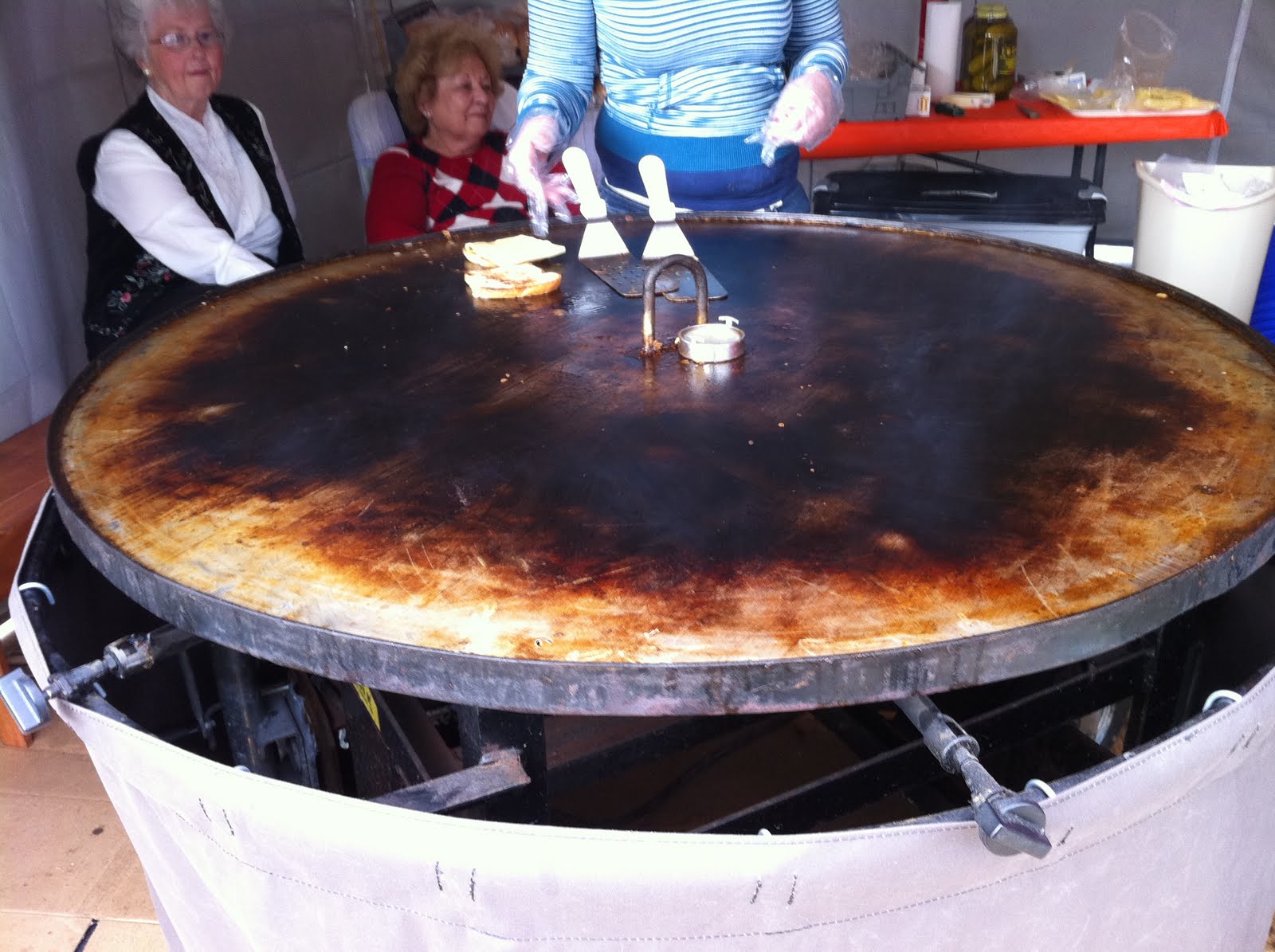 They grilled two pieces of homemade bread on a hot, rotating disk…