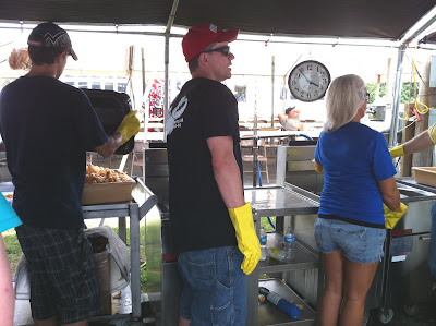 …as volunteer fryers sweat over the crackling pork skins.